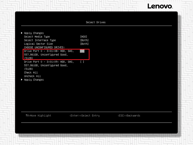 联想各系列服务器的UEFI HII界面有所不同,ThinkSystem系列服务器在文字界面选择硬盘(如创建阵列)时,要在选中的硬盘上按空格键,使右侧"[ ]"变成"[X]"。