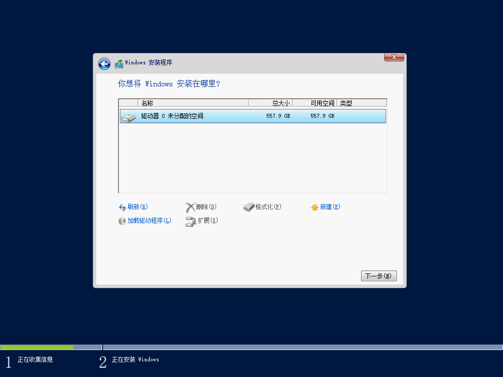 然后即可发现卷和硬盘,可新建分区并下一步开始安装操作系统。